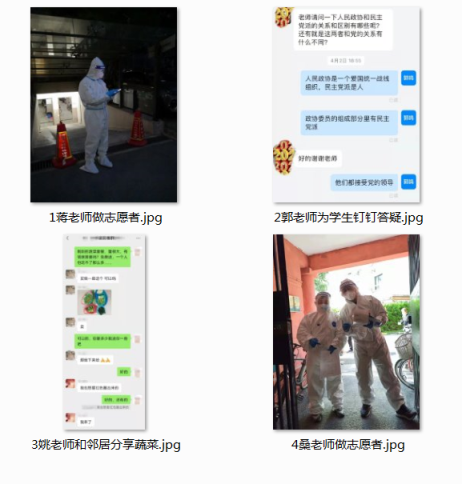 蒋杰同志:用心教学:1、为了准时可以开通教室,一般是提前半小时开通教室,并在各班级群里发出教室链接,方便学生进入教室;2、对因为上课期间核酸检测的同学在当天的中午开通教室,进行课后辅导;3、对被隔离的同学,及时与家长沟通,提供力所能及的帮助;4、教学中,提问是常态,以确保大家的线上学习专注度;5、及时批阅作业,做到全批全改;6、为了及时回答学生问题,开通每日晚间的六点半答疑。力战疫情:1、及时在所在居委(枫林居委)报到,亮明身份,积极参加小区抗疫活动;2、参加核酸志愿者活动;3、组织本楼的志愿者成立互助小组,在团购中发挥作用;4、报名楼道物资运送小组,发放生活必需品和抗原、消毒液等抗疫物资;5、参加楼道消杀工作,定期或在核酸检测前对本楼层进行消杀。